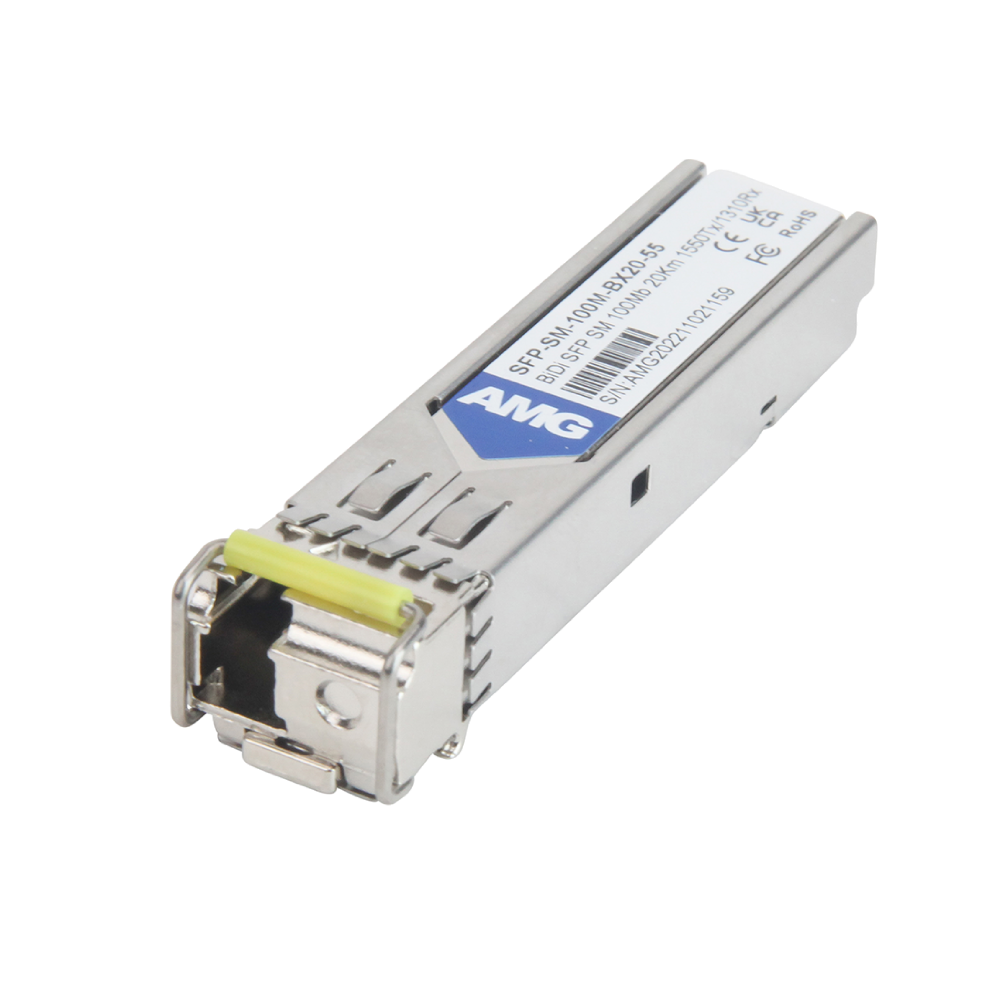 SFP Tek Modlu modül, 100 Mb hızında tek fiberle 20 km mesafe sunar; LC konnektörlü, 1550nm Tx / 1310nm Rx dalga boylarında çalışır. -40°C ila +85°C sıcaklık aralığında çalışabilir ve DDM desteklidir. (SFP-SM-100MB X20-31 ile uyumludur.)
